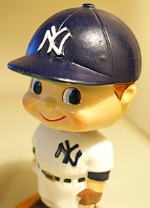 右の写真は我が家の坊や。1960年代頃のヤンキースのバブルヘッド(首振り人形)です。